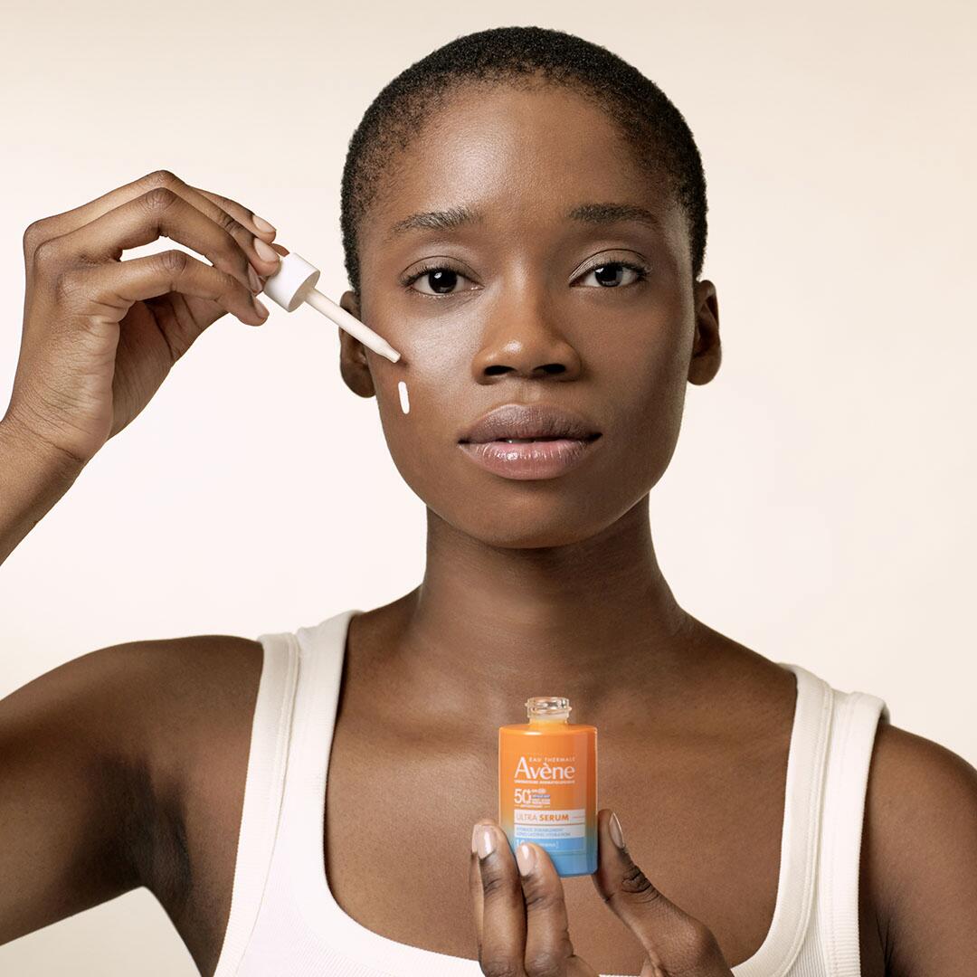 La protezione molto alta di un solare, L’efficacia idratante di un trattamento, in un siero dalla consistenza ultra leggera.